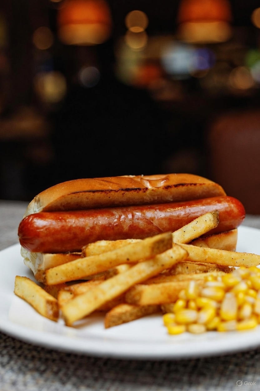 All Beef Hot Dog Served with Potato Wedges and Steamed Buttered Corn